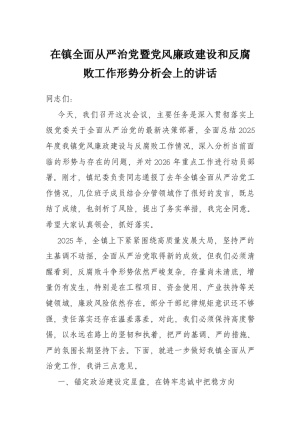 在镇全面从严治党暨党风廉政建设和反腐败工作形势分析会上的讲话