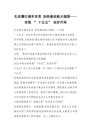 扎实履行强军首责 加快建设航天强国——实现 “ 十五五” 良好开局