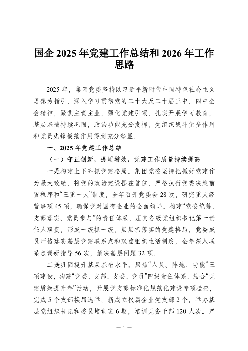 国企2025年党建工作总结和2026年工作思路