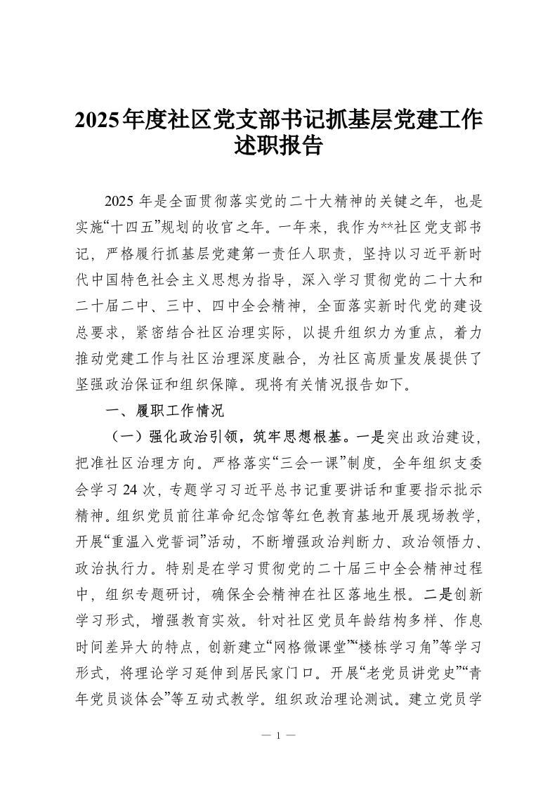 首页精选范文2025年度社区党支部书记抓基层党建工作述职报告