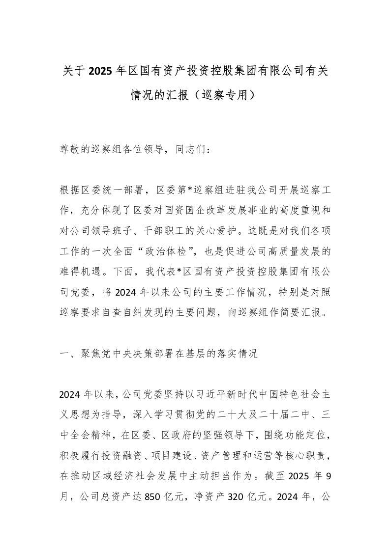 首页精选范文关于2025年区国有资产投资控股集团有限公司有关情况的汇报(巡察专用)_副本