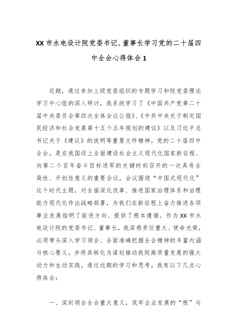 首页精选范文XX市水电设计院党委书记、董事长学习党的二十届四中***心得体会1_副本