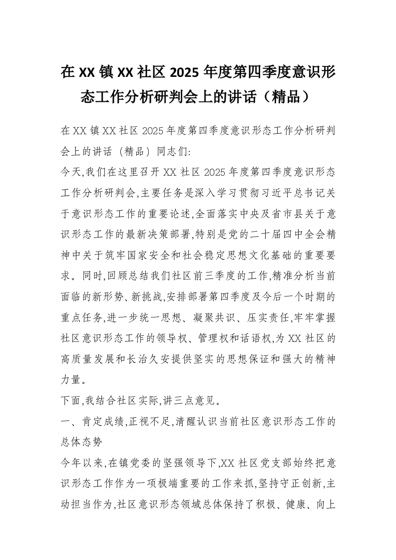 在XX镇XX社区2025年度第四季度意识形态工作分析研判会上的讲话(精品)