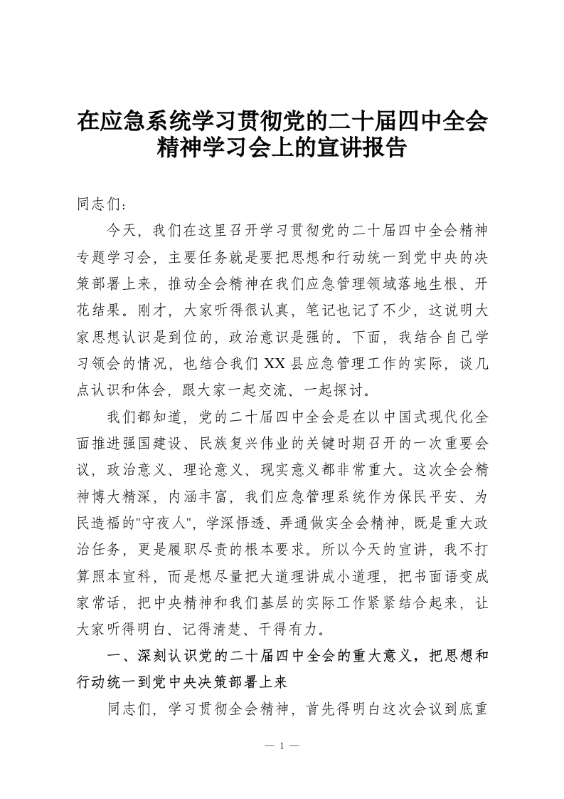 在应急系统学习贯彻党的二十届四中***精神学习会上的宣讲报告