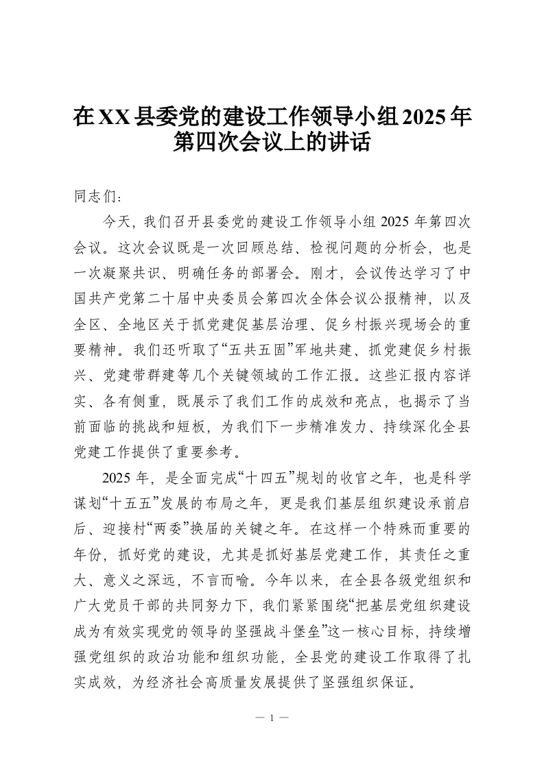 在XX县委党的建设工作领导小组2025年第四次会议上的讲话