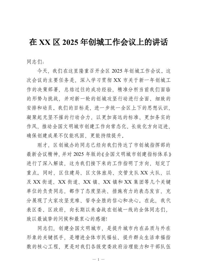 在XX区2025年创城工作会议上的讲话