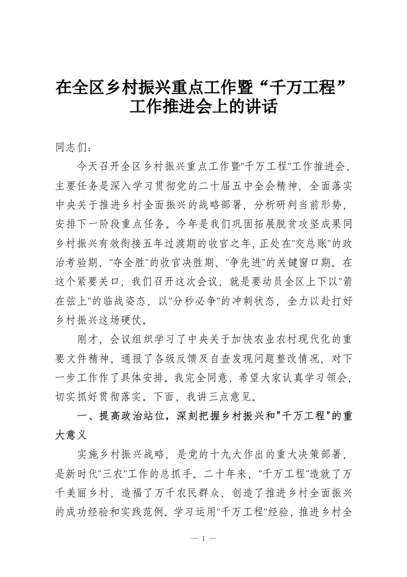 在全区乡村振兴重点工作暨“千万工程”工作推进会上的讲话