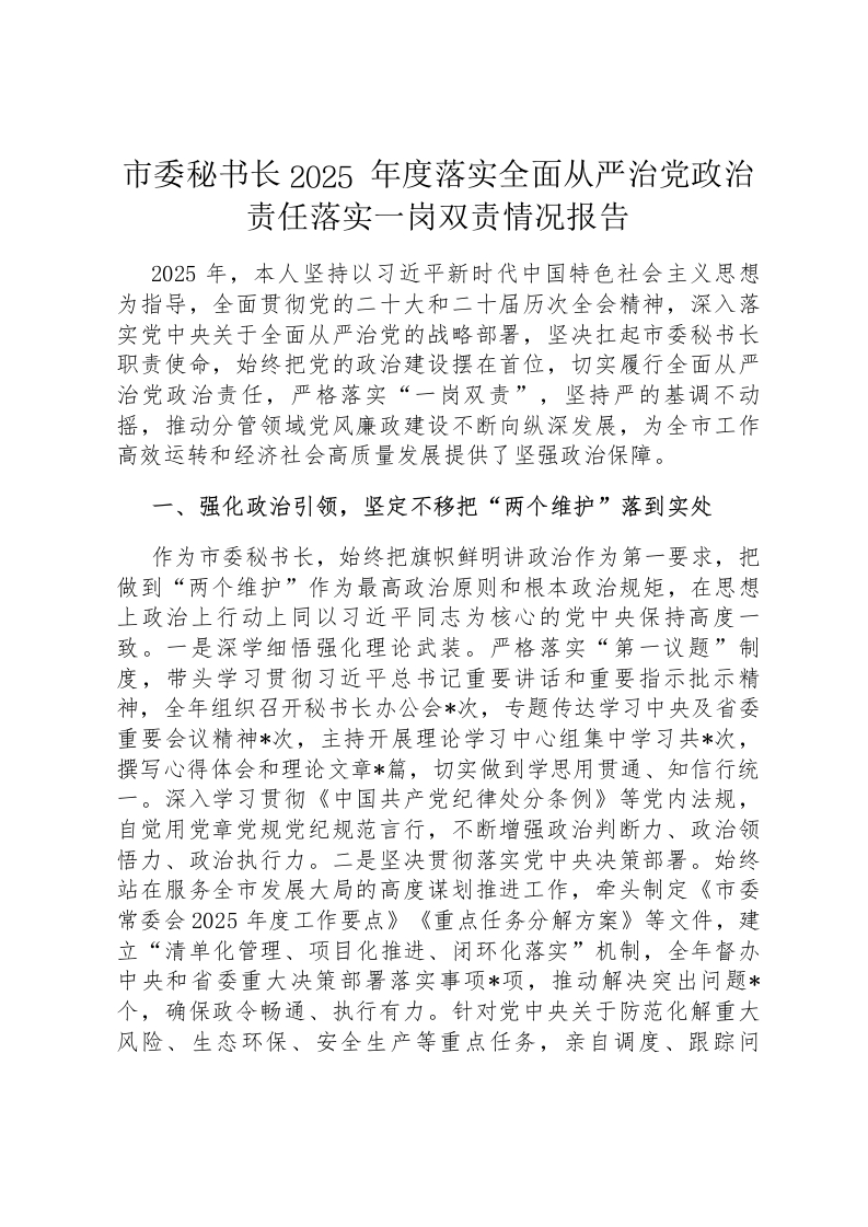 市委秘书长2025年度落实全面从严治党政治责任落实一岗双责情况报告