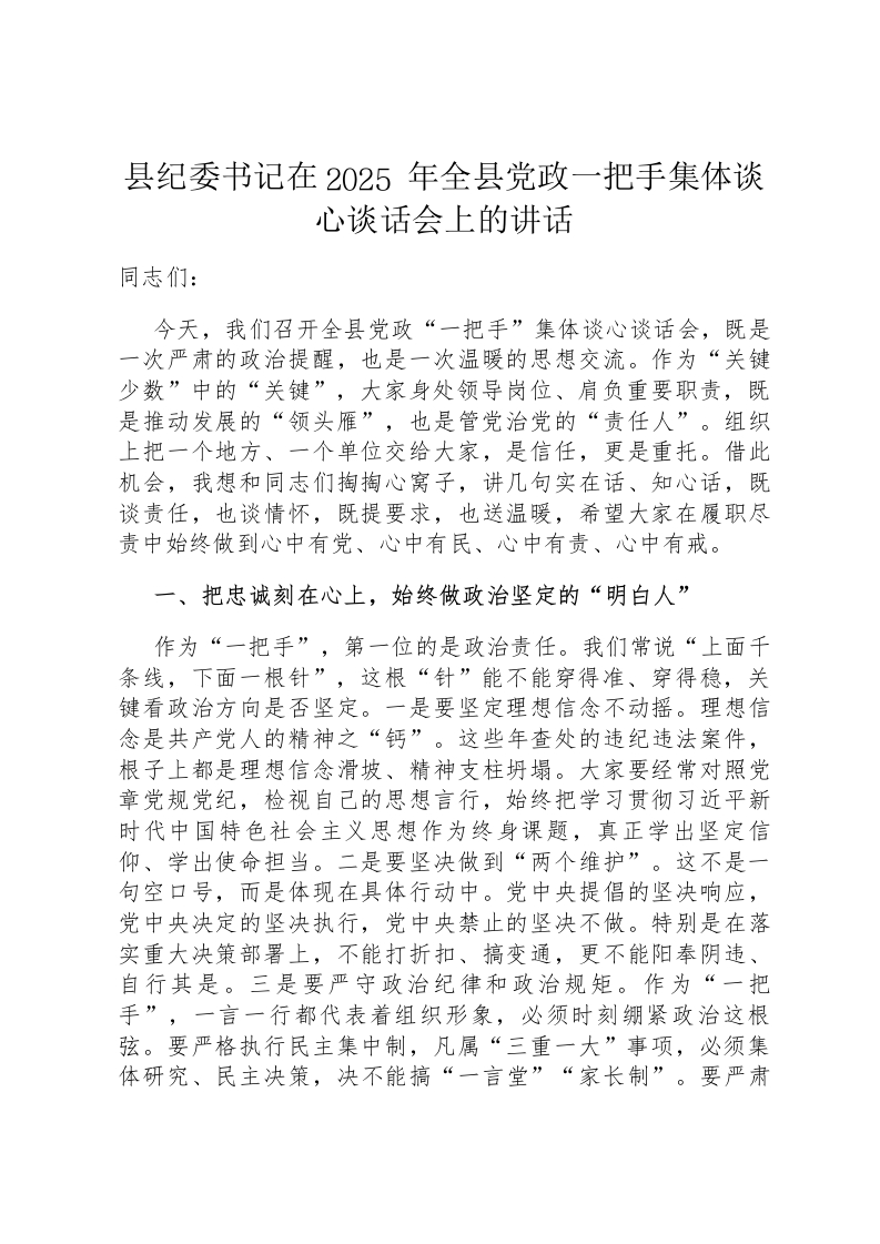 首页材料汇编县纪委书记在2025年全县党政一把手集体谈心谈话会上的讲话