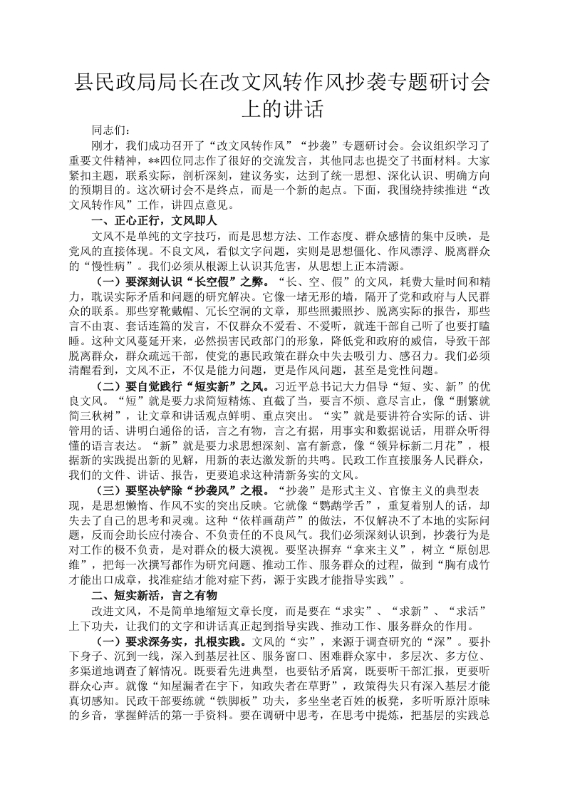 县民政局局长在改文风转作风公文抄袭专题研讨会上的讲话