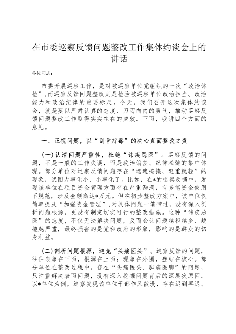 在市委巡察反馈问题整改工作集体约谈会上的讲话