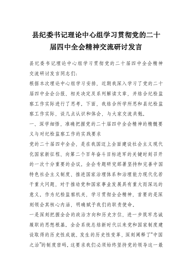首页精选范文县纪委书记理论中心组学习贯彻党的二十届四中***精神交流研讨发言