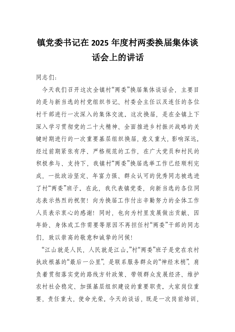 首页精选范文镇党委书记在2025年度村两委换届集体谈话会上的讲话