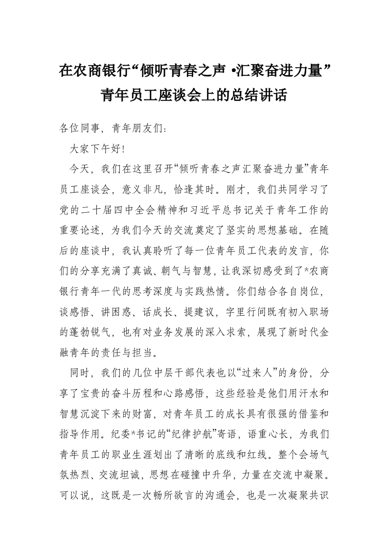 在农商银行“倾听青春之声·汇聚奋进力量”青年员工座谈会上的总结讲话