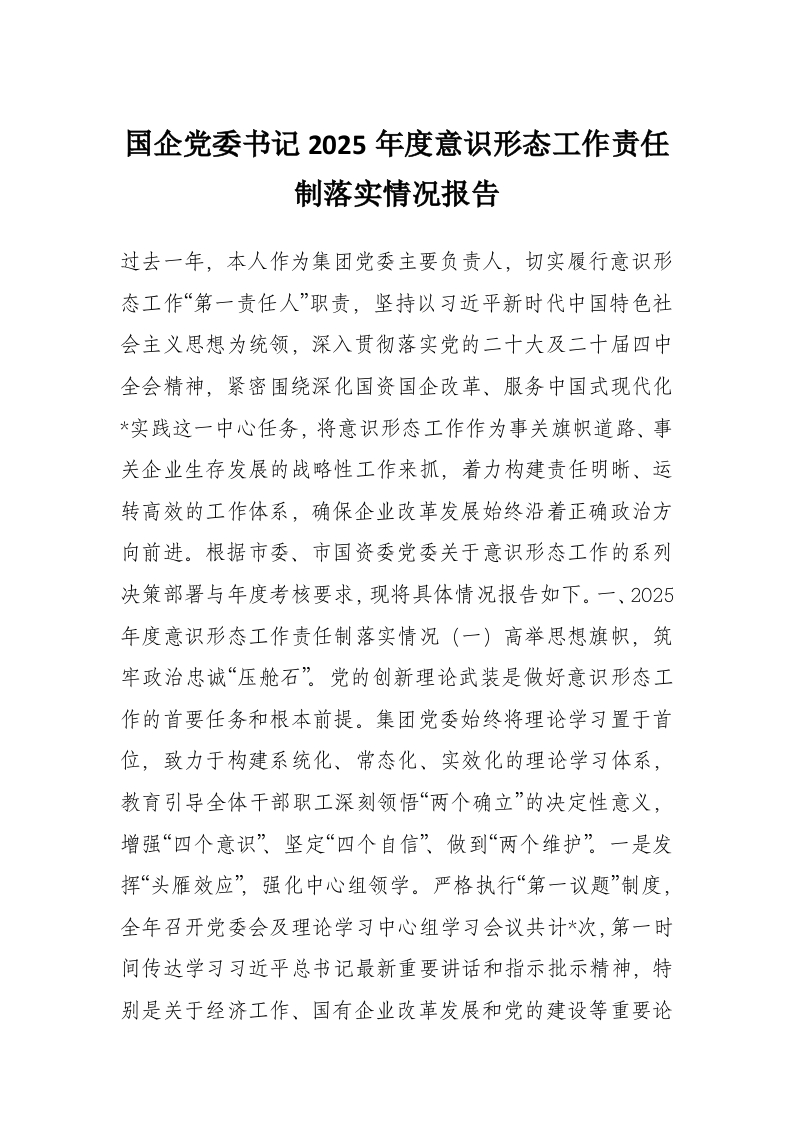 首页讲课讲稿国企党委书记2025年度意识形态工作责任制落实情况报告