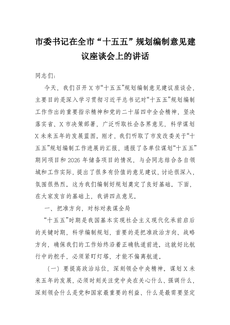 首页讲课讲稿市委书记在全市“十五五”规划编制意见建议座谈会上的讲话