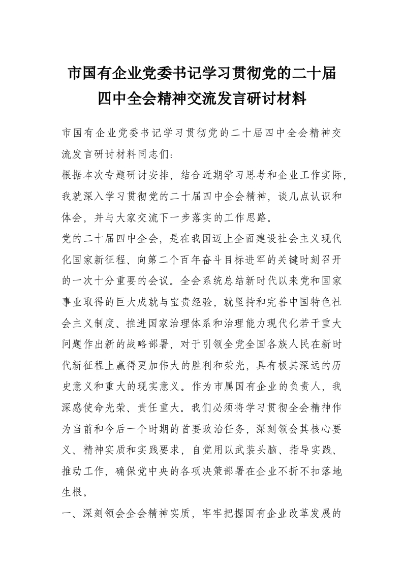 市国有企业党委书记学习贯彻党的二十届四中***精神交流发言研讨材料