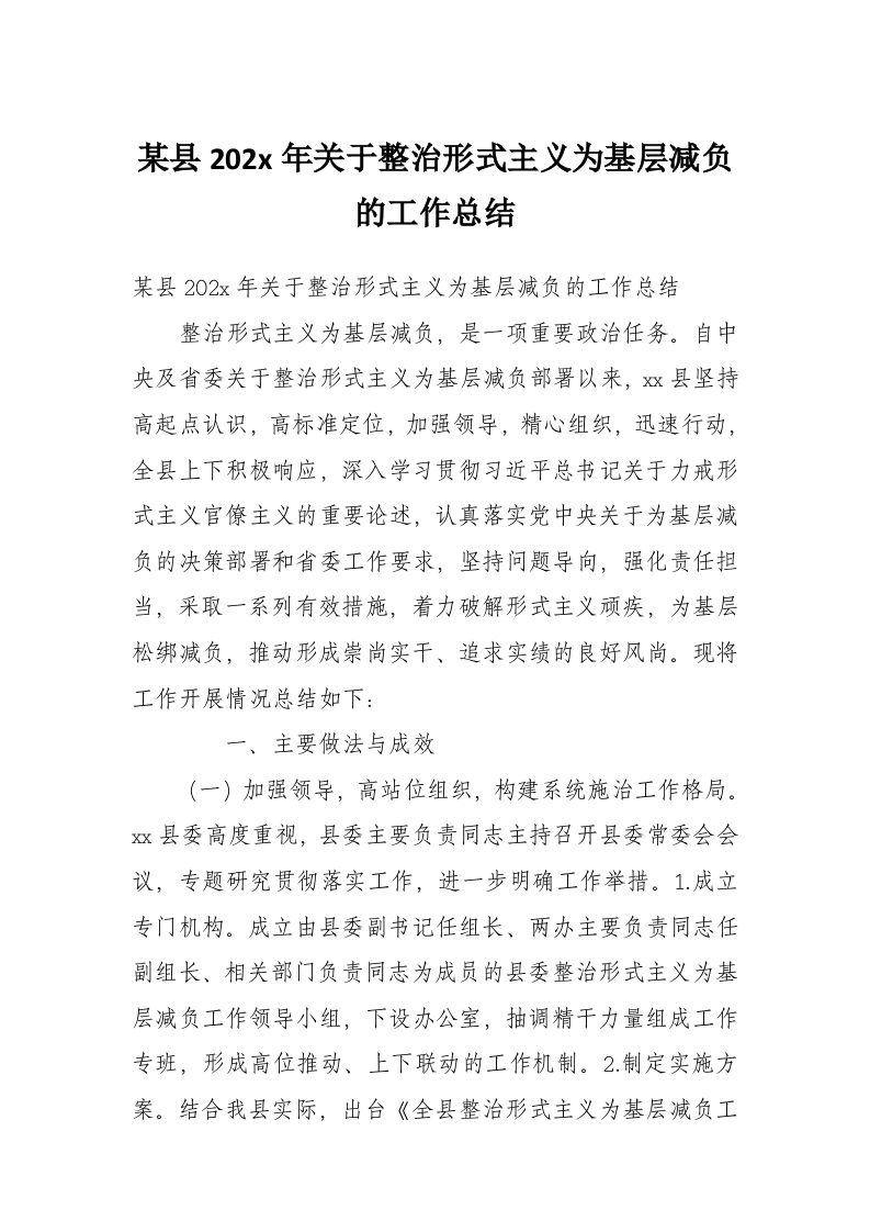 某县202x年关于整治形式主义为基层减负的工作总结