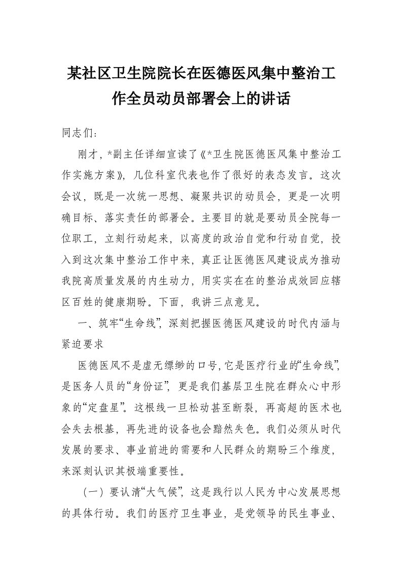 某社区卫生院院长在医德医风集中整治工作全员动员部署会上的讲话