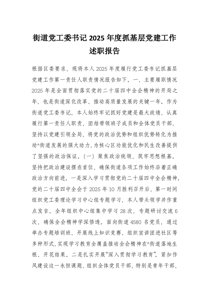 街道党工委书记2025年度抓基层党建工作述职报告