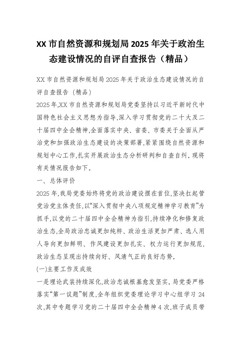 首页写作素材XX市自然资源和规划局2025年关于政治生态建设情况的自评自查报告(精品)