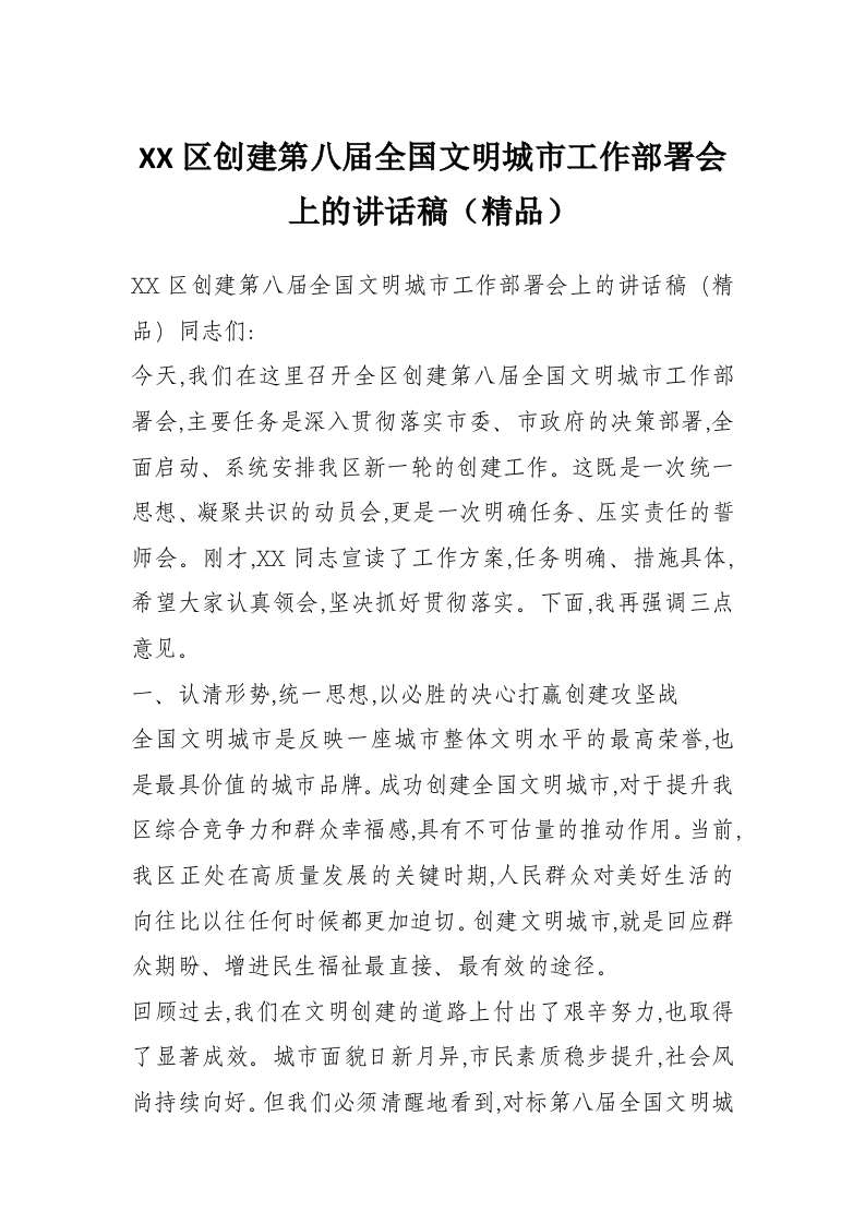 XX区创建第八届全国文明城市工作部署会上的讲话稿(精品)