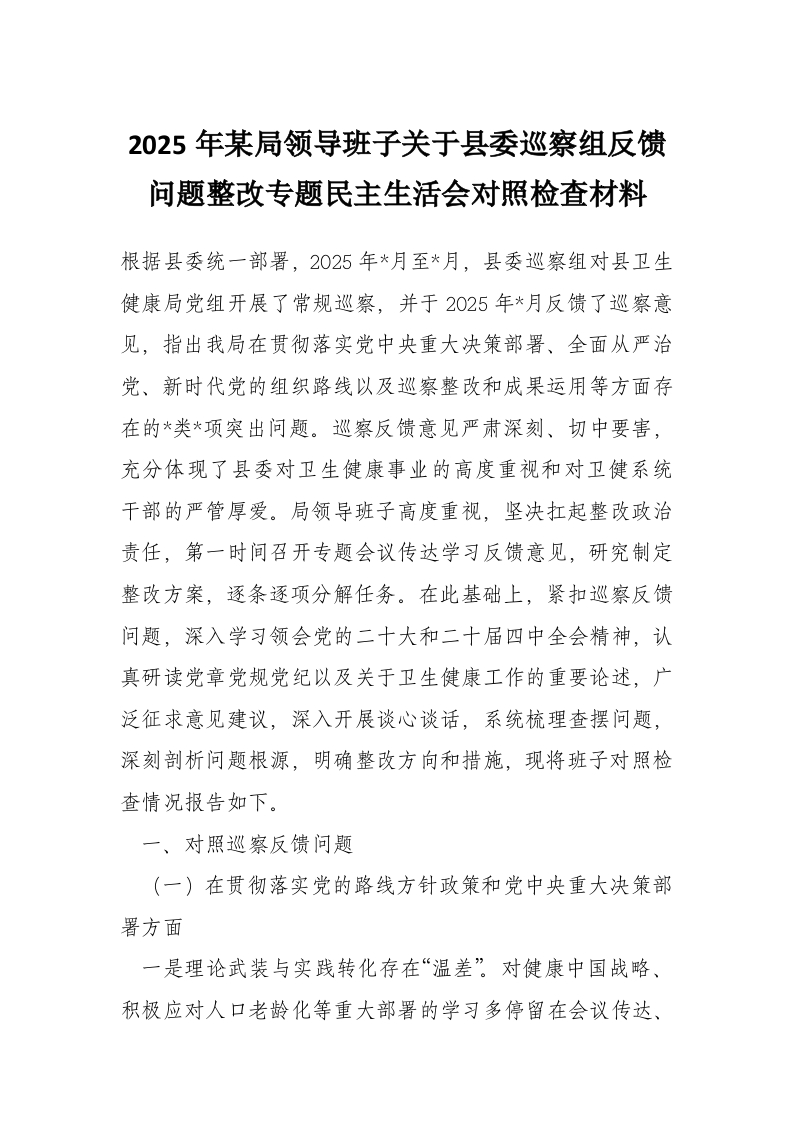2025年某局领导班子关于县委巡察组反馈问题整改专题民主生活会对照检查材料