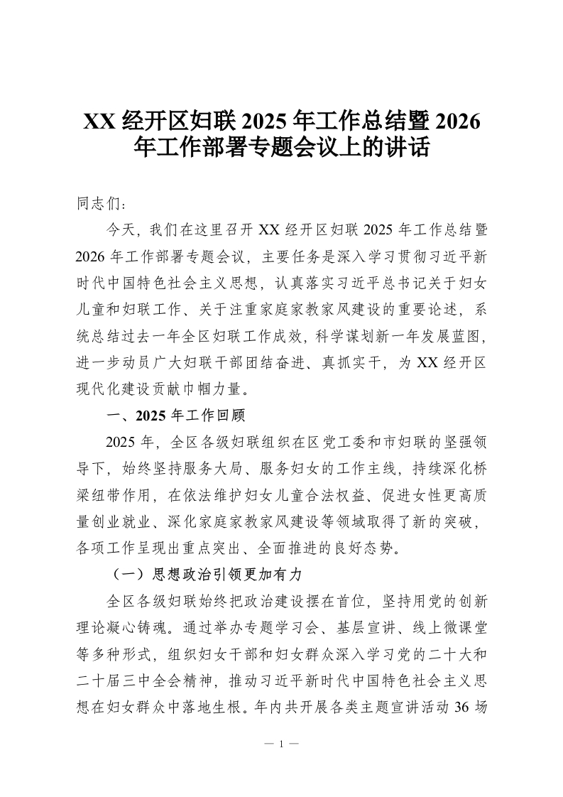 XX经开区妇联2025年工作总结暨2026年工作部署专题会议上的讲话