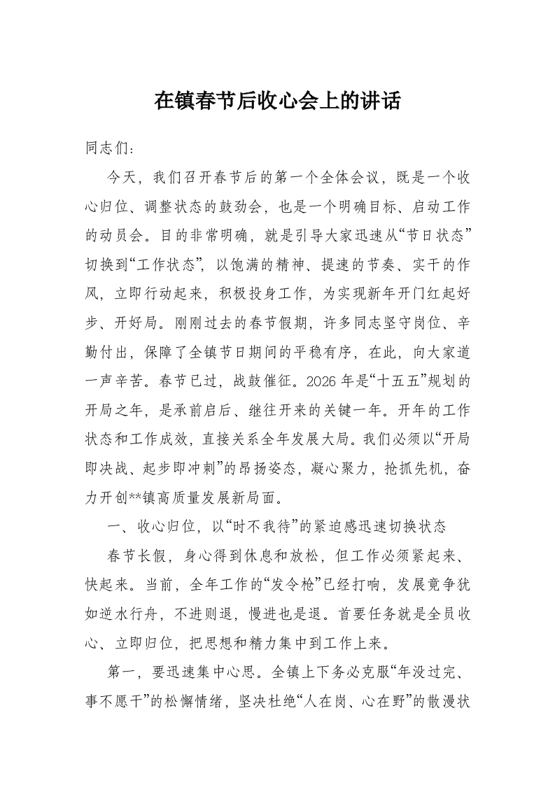 在镇春节后收心会上的讲话