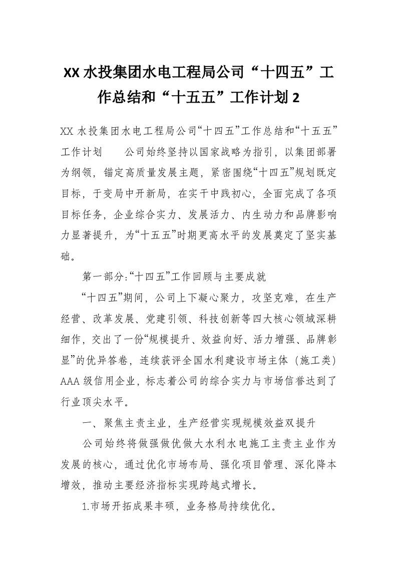 XX水投集团水电工程局公司“十四五”工作总结和“十五五”工作计划2