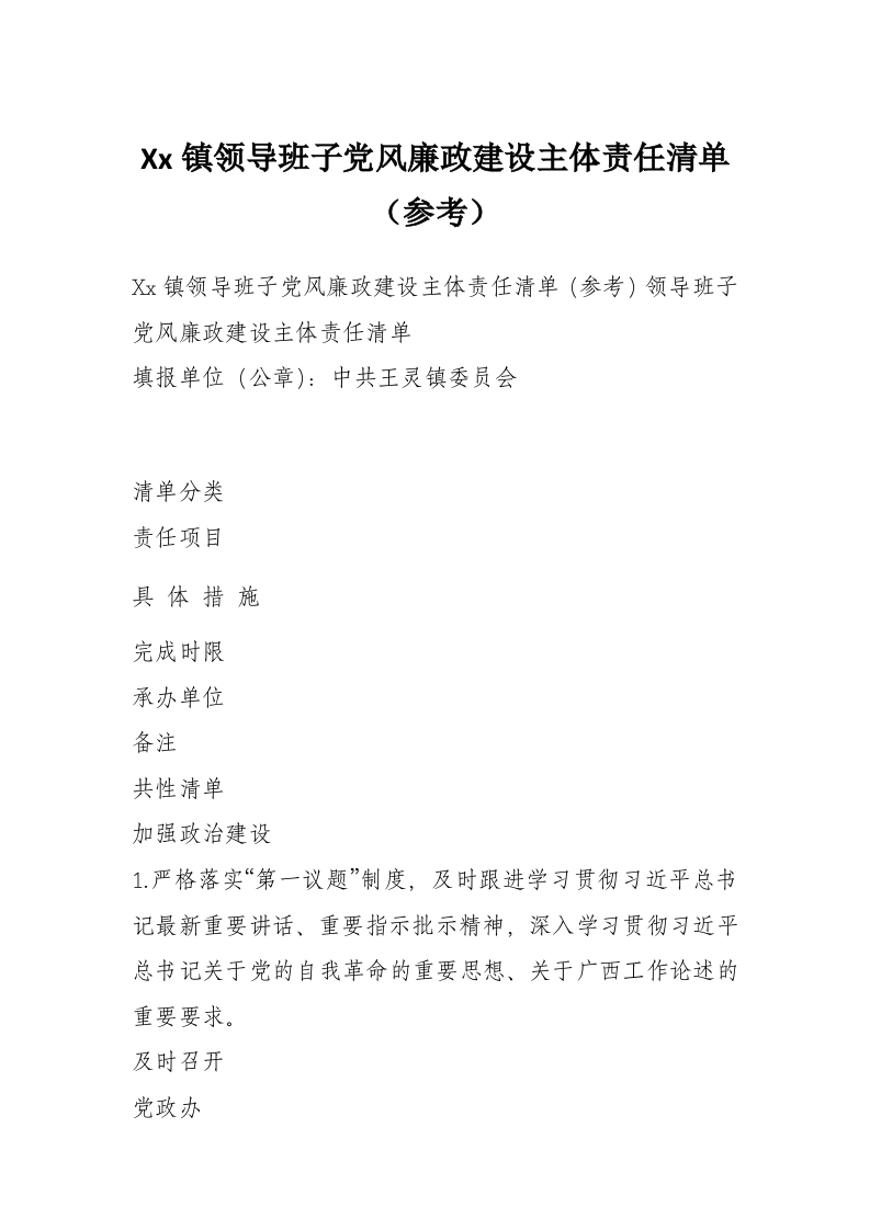 Xx镇领导班子党风廉政建设主体责任清单(参考)