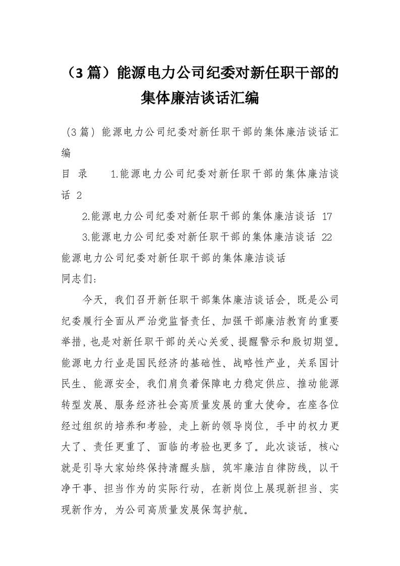 (3篇)能源电力公司纪委对新任职干部的集体廉洁谈话汇编