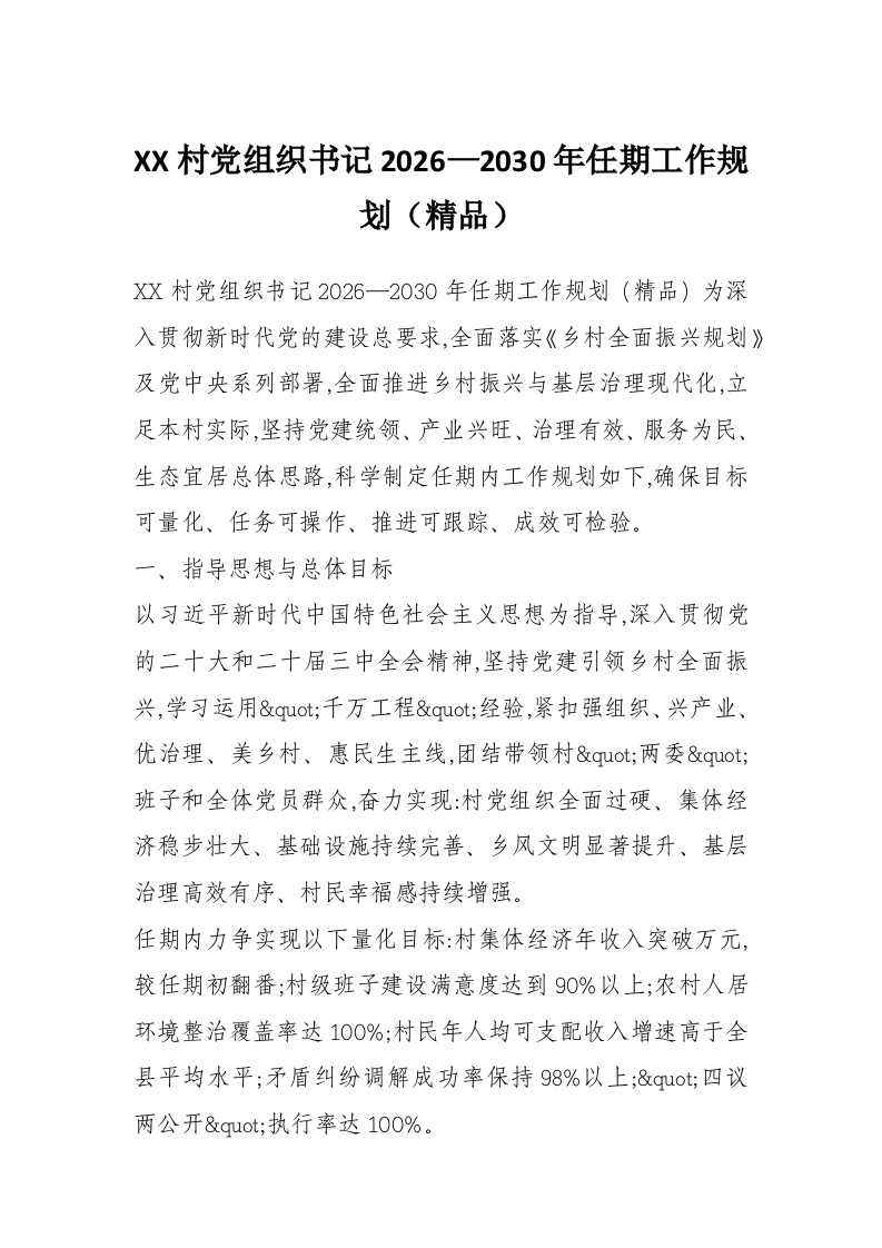 XX村党组织书记2026—2030年任期工作规划(精品)