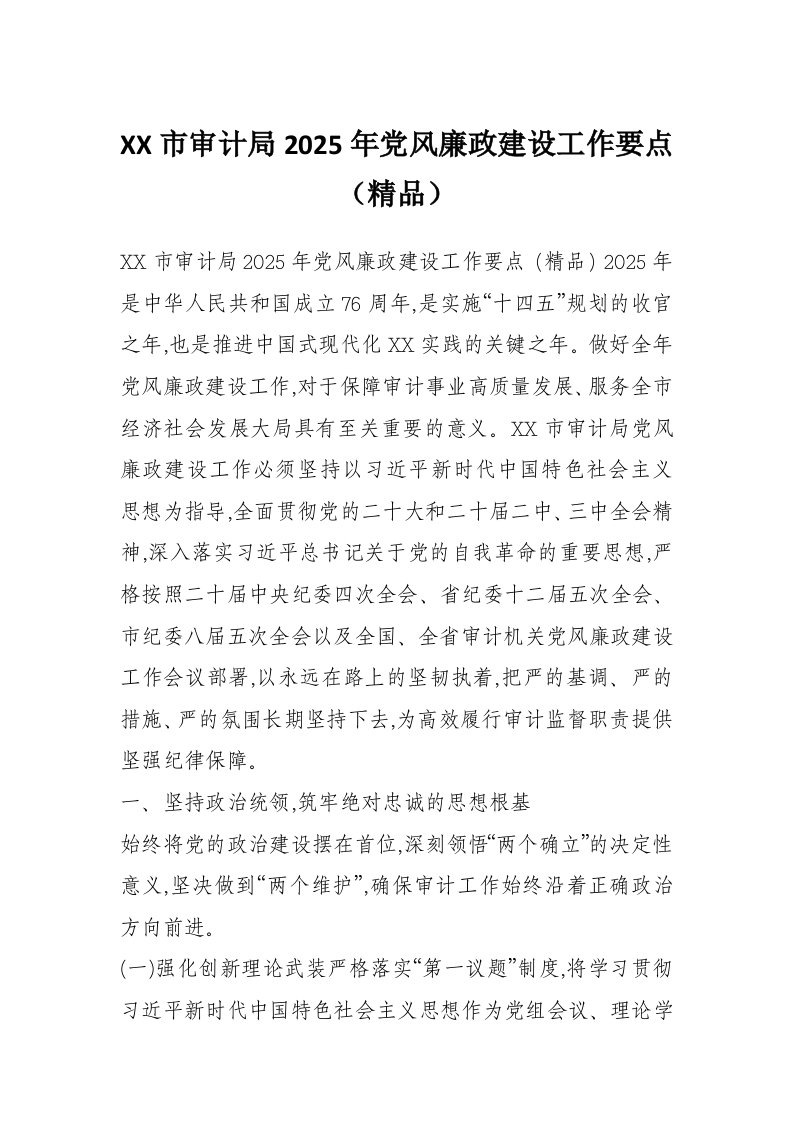 XX市审计局2025年党风廉政建设工作要点(精品)