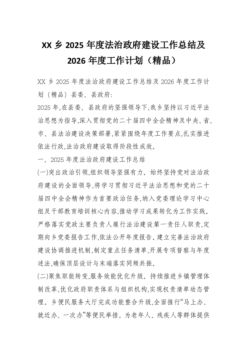 XX乡2025年度法治***建设工作总结及2026年度工作计划(精品)
