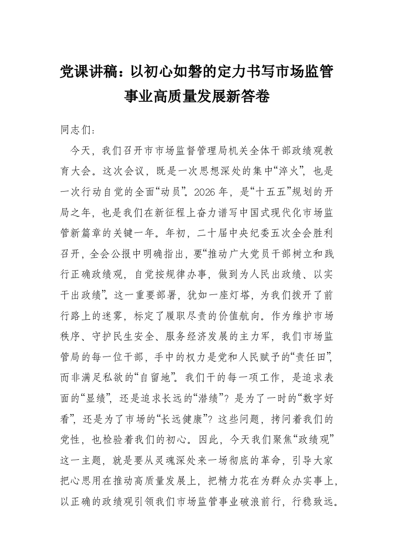 首页精选范文党课讲稿:以初心如磐的定力书写市场监管事业高质量发展新答卷