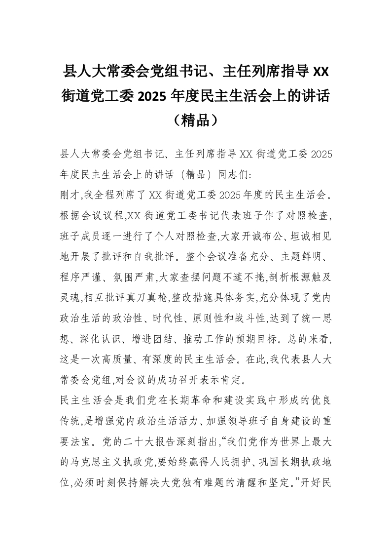 县人大常委会党组书记、主任列席指导XX街道党工委2025年度民主生活会上的讲话(精品)