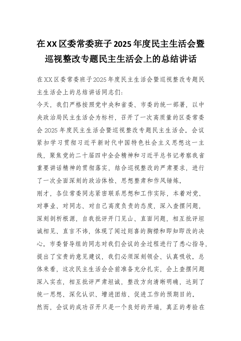 在XX区委常委班子2025年度民主生活会暨巡视整改专题民主生活会上的总结讲话