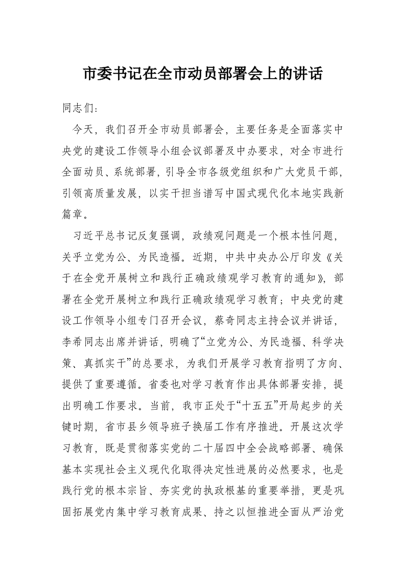市委书记在全市动员部署会上的讲话