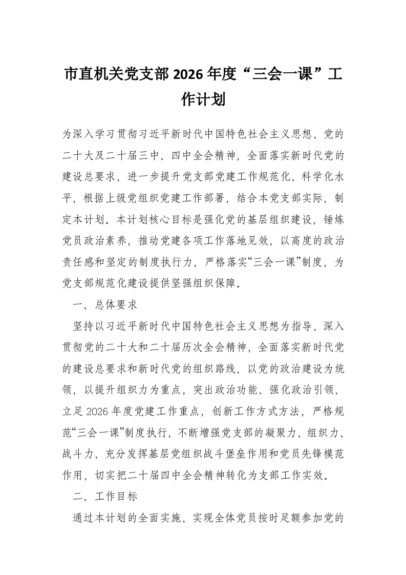 首页工作文档市直机关党支部2026年度“三会一课”工作计划