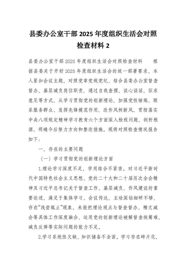 首页工作文档县委办公室干部2025年度组织生活会对照检查材料2