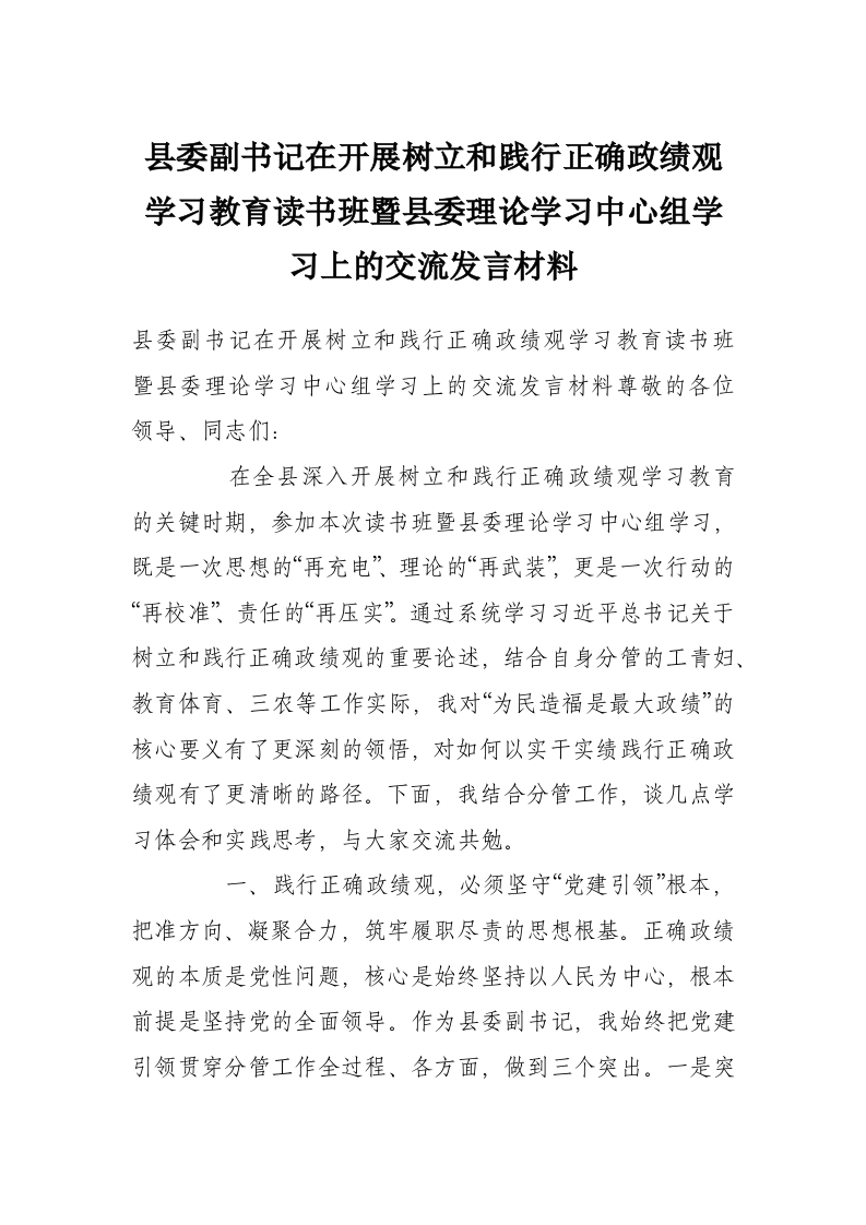 县委副书记在开展树立和践行正确政绩观学习教育读书班暨县委理论学习中心组学习上的交流发言材料