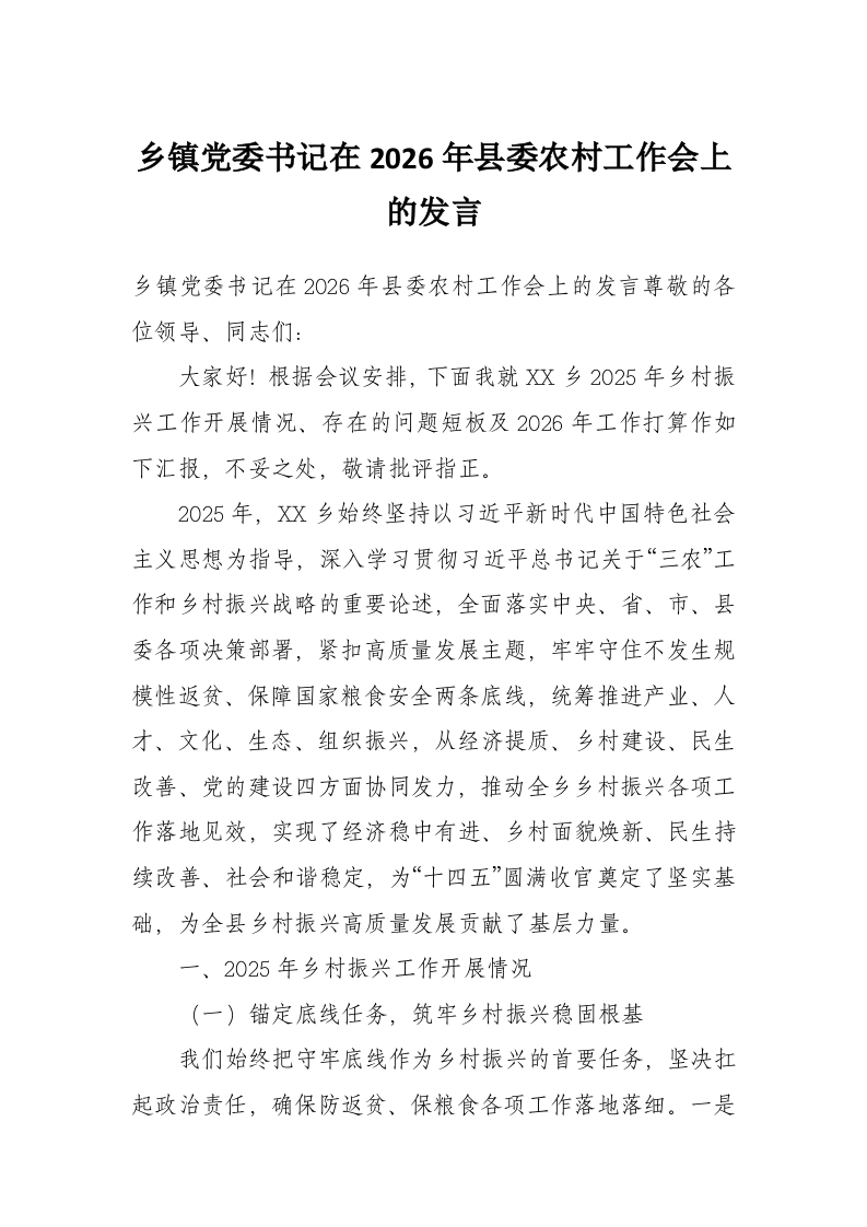 首页工作文档乡镇党委书记在2026年县委农村工作会上的发言