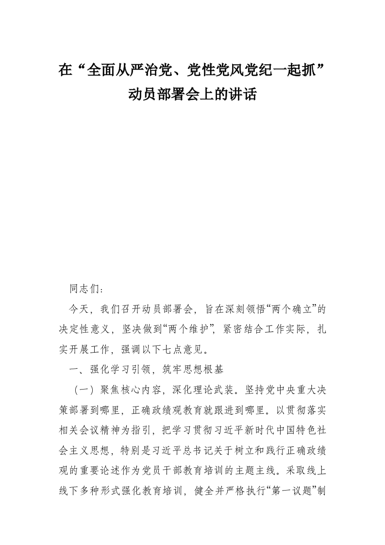 在“全面从严治党、党性党风党纪一起抓”动员部署会上的讲话