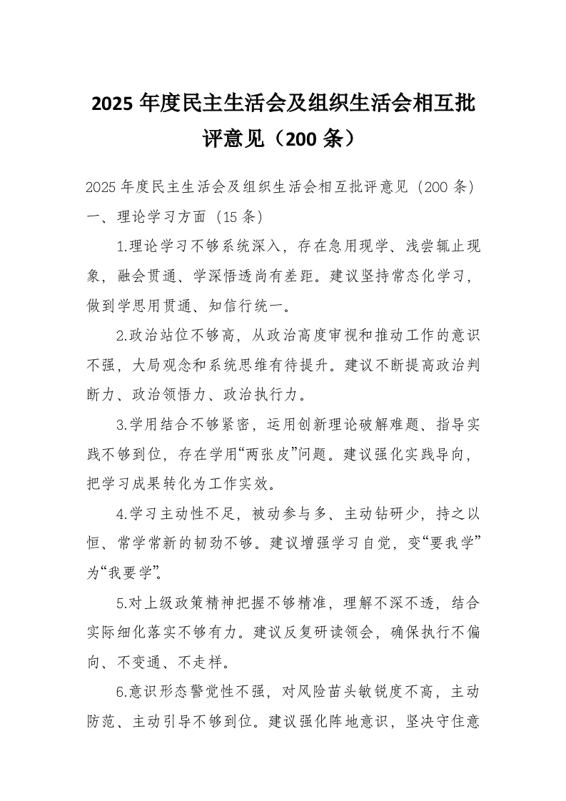 2025年度民主生活会及组织生活会相互批评意见(200条)
