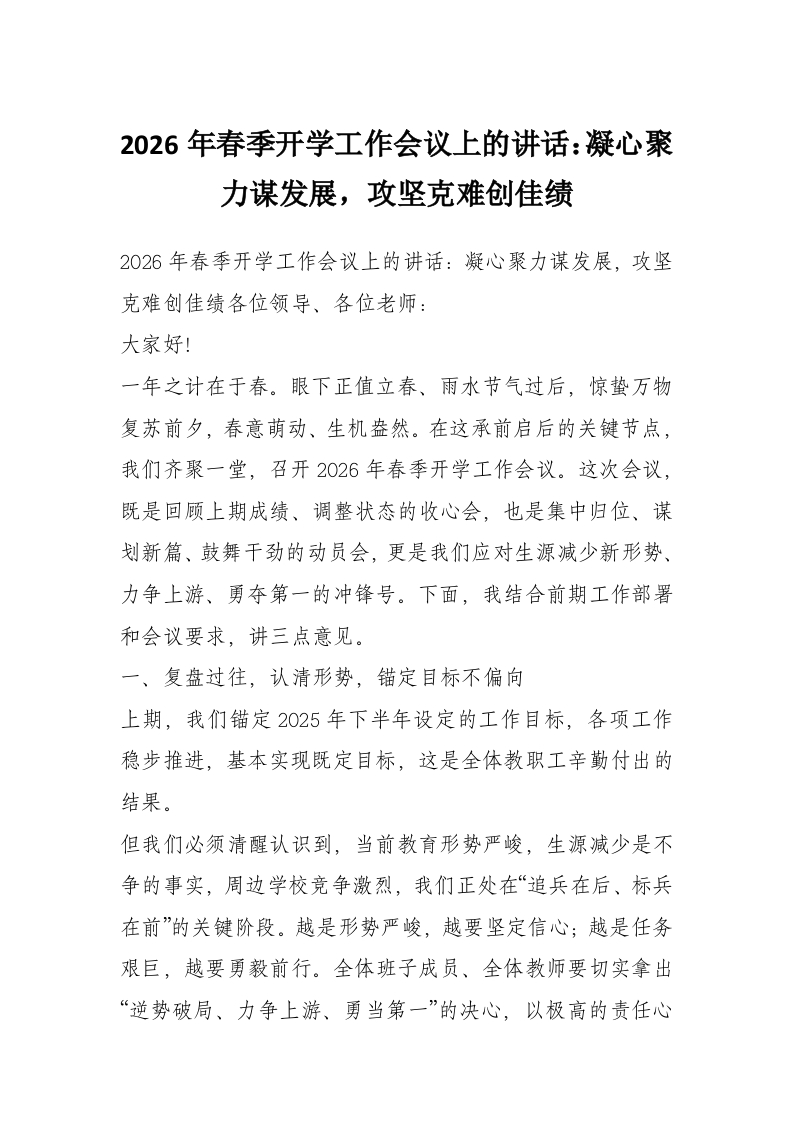 2026年春季开学工作会议上的讲话:凝心聚力谋发展,攻坚克难创佳绩
