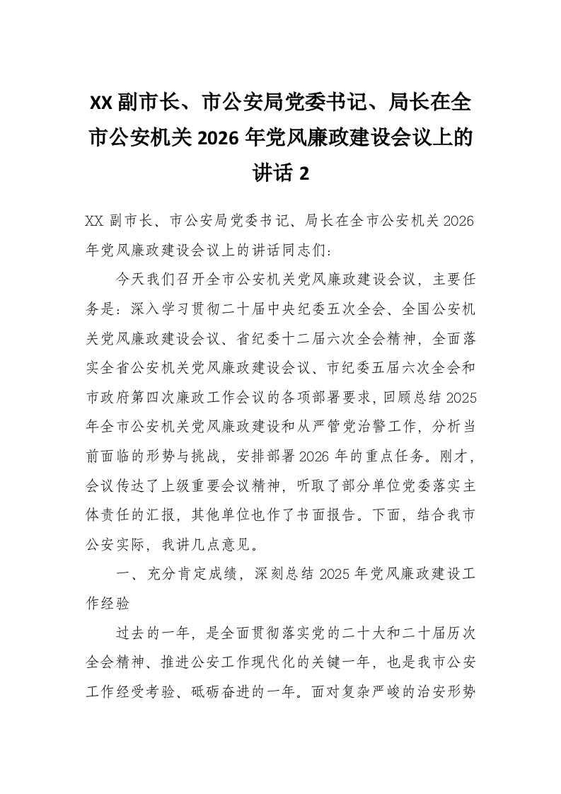 XX副市长、市公安局党委书记、局长在全市公安机关2026年党风廉政建设会议上的讲话2
