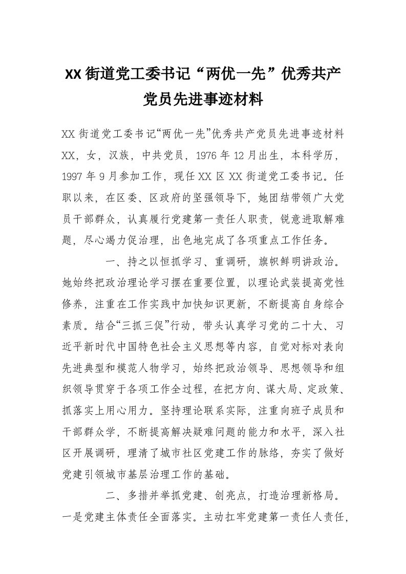 XX街道党工委书记“两优一先”优秀***员先进事迹材料
