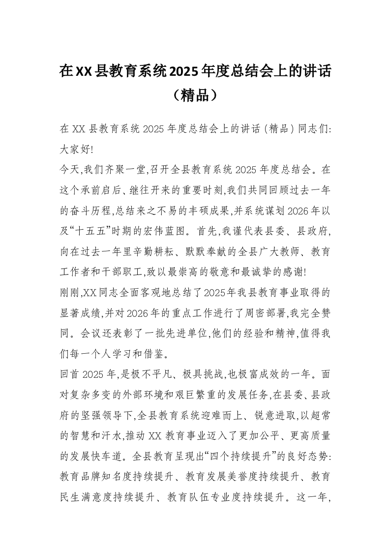 在XX县教育系统2025年度总结会上的讲话(精品)