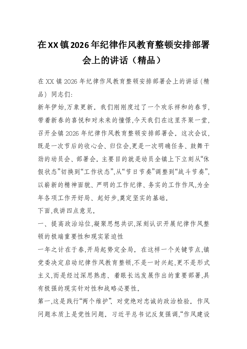 在XX镇2026年纪律作风教育整顿安排部署会上的讲话(精品)